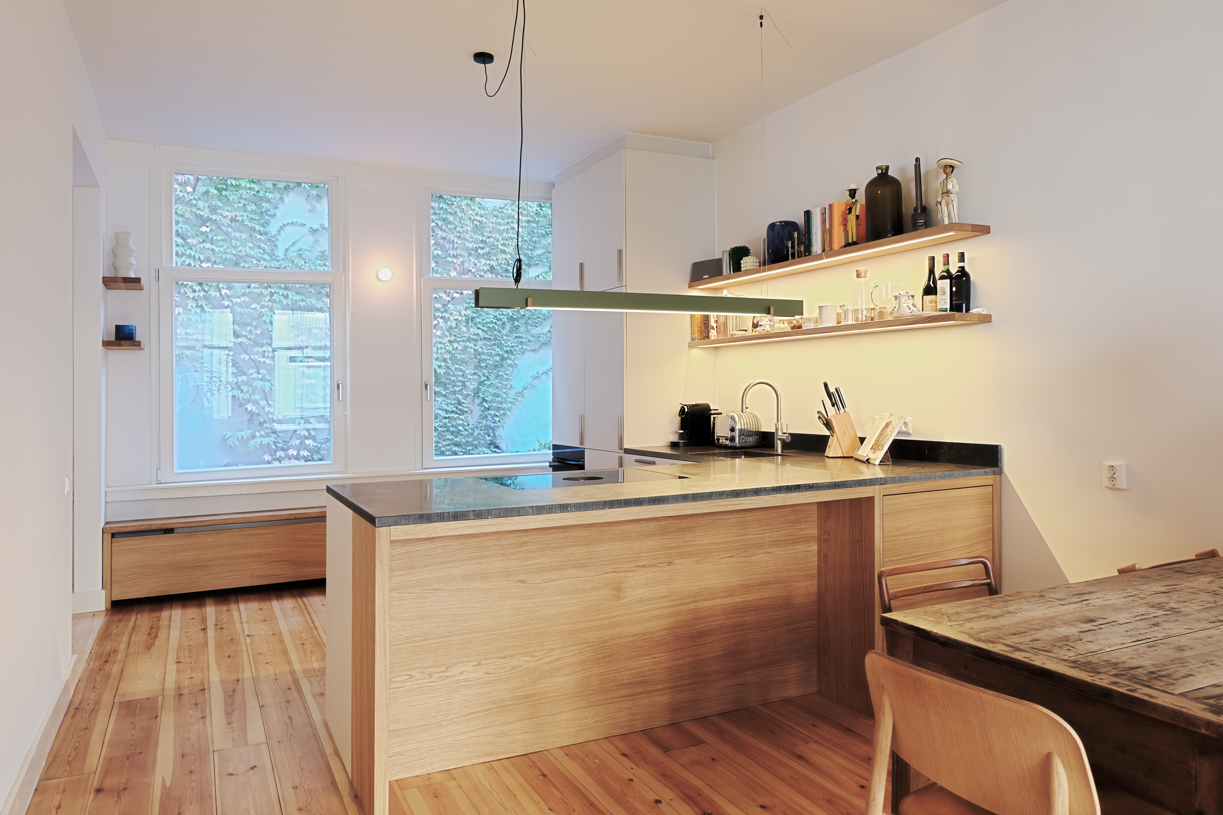This timeless and sophisticated kitchen design on the Vondelkerkstraat in Amsterdam maximizes light and creates a social gathering space, made by local craftsmen and using sustainable materials. Satin seashell cabinets, warm European oak and Belgian hardstone worktop with chiseled edge create the basis for a timeless, warm and durable design, which consists of an L-form kitchen with bar, shelving, and window seating. The kitchen drawers are made from European birch wood.